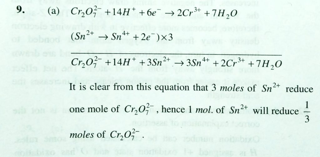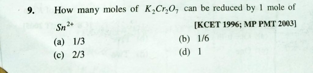 How many moles of K2Cr2O7 can be reduced by 1 mole of Sn^2+ (a) 1/3 (b) 1/6 (c) 2/3 (d) 1 How many moles of K2Cr2O7 can be reduced by 1 mole of Sn^2+ (a) 1/3 (b) 1/6 (c) 2/3 (d) 1 November 24, 2020 Category: Uncategorised (JEE Advanced Physics by BM Sharma + GMP Solutions) , Facebook Messenger WhatsApp Share this:TwitterFacebook Related