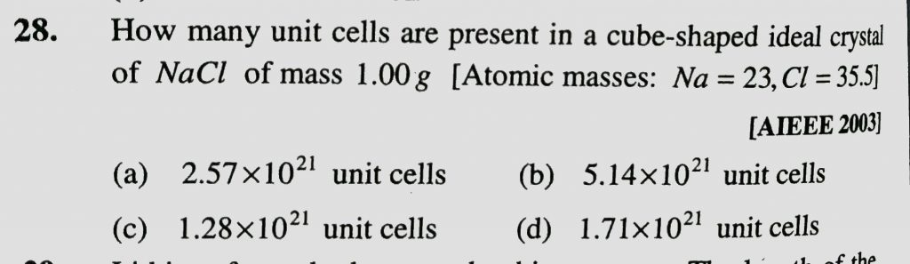 How many unit cells are present in a cube – shaped ideal crystal of NaCl of mass 1.00 g [ Atomic masses : Na = 23 , Cl = 35.5 ] Cl = 35.5 ] How many unit cells are present in a cube - shaped ideal crystal of NaCl of mass 1.00 g [ Atomic masses : Na = 23 December 17, 2020 Category: Uncategorised (JEE Advanced Physics by BM Sharma + GMP Solutions) , Facebook Messenger WhatsApp Share this:TwitterFacebook Related