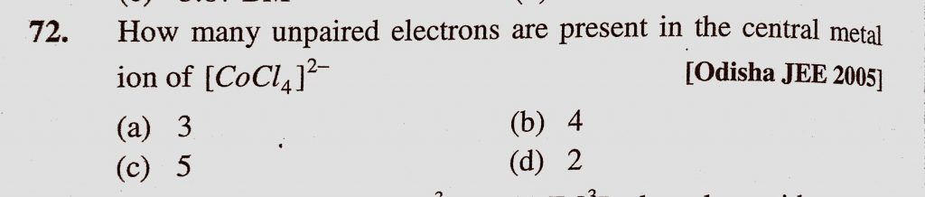 How many unpaired electrons are present in the central metal ion of (CoCl4) 2- (a) 3 (b) 4 (c) 5 (d) 2 How many unpaired electrons are present in the central metal ion of (CoCl4) 2- (a) 3 (b) 4 (c) 5 (d) 2 December 4, 2020 Category: Uncategorised (JEE Advanced Physics by BM Sharma + GMP Solutions) , Facebook Messenger WhatsApp Share this:TwitterFacebook Related
