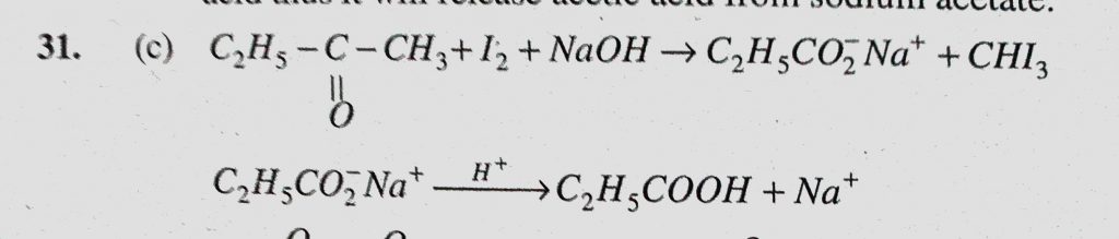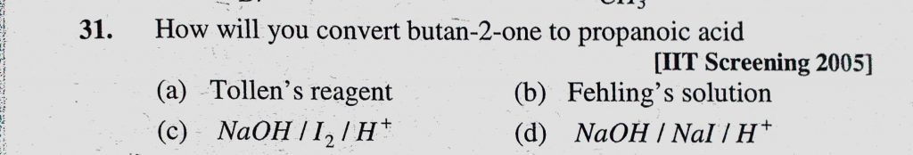 How will you convert butan-2-one to propanoic acid (a) Tollen’s reagent (b) Fehling’s solution (c) NaOH / I2/ H+ (d) NaOH / NaI / H+ How will you convert butan-2-one to propanoic acid (a) Tollen's reagent (b) Fehling's solution (c) NaOH / I2/ H+ (d) NaOH / NaI / H+ February 13, 2021 Category: Uncategorised (JEE Advanced Physics by BM Sharma + GMP Solutions) , Facebook Messenger WhatsApp Share this:TwitterFacebook Related