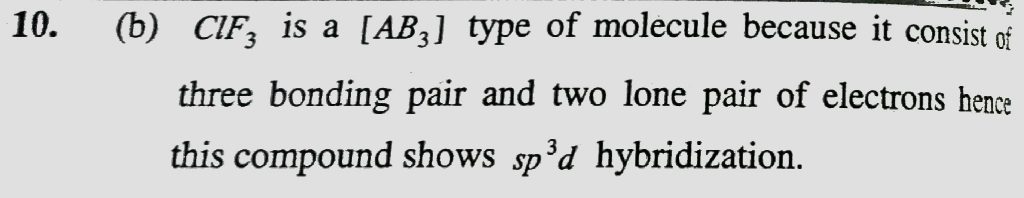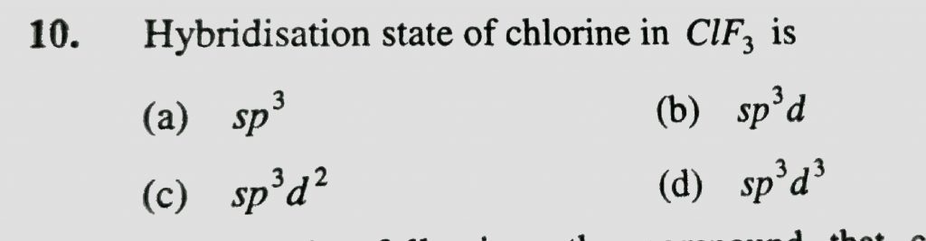 Hybbridisation state of chlorine in CLF3 is (a) sp^3 (b) sp^3d (c) sp^3d^2 (d) sp^3d^3 Hybbridisation state of chlorine in CLF3 is (a) sp^3 (b) sp^3d (c) sp^3d^2 (d) sp^3d^3 December 9, 2020 Category: Uncategorised (JEE Advanced Physics by BM Sharma + GMP Solutions) , Facebook Messenger WhatsApp Share this:TwitterFacebook Related