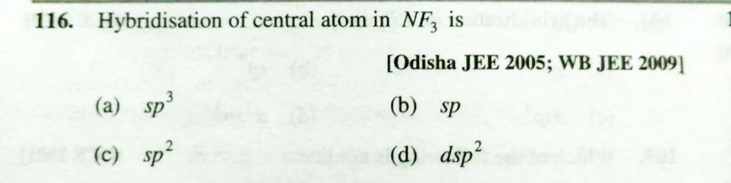 Hybridisation of central atom in NF3 is (a) sp^3 (b) sp (c) sp^2 (d) dsp^2 Hybridisation of central atom in NF3 is (a) sp^3 (b) sp (c) sp^2 (d) dsp^2 December 6, 2020 Category: Uncategorised (JEE Advanced Physics by BM Sharma + GMP Solutions) , Facebook Messenger WhatsApp Share this:TwitterFacebook Related