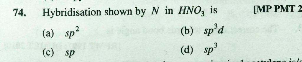 Hybridisation shown by N in HNO3 is (a) sp^2 (b) sp^3d (c) sp (d) sp^3 Hybridisation shown by N in HNO3 is (a) sp^2 (b) sp^3d (c) sp (d) sp^3 December 6, 2020 Category: Uncategorised (JEE Advanced Physics by BM Sharma + GMP Solutions) , Facebook Messenger WhatsApp Share this:TwitterFacebook Related