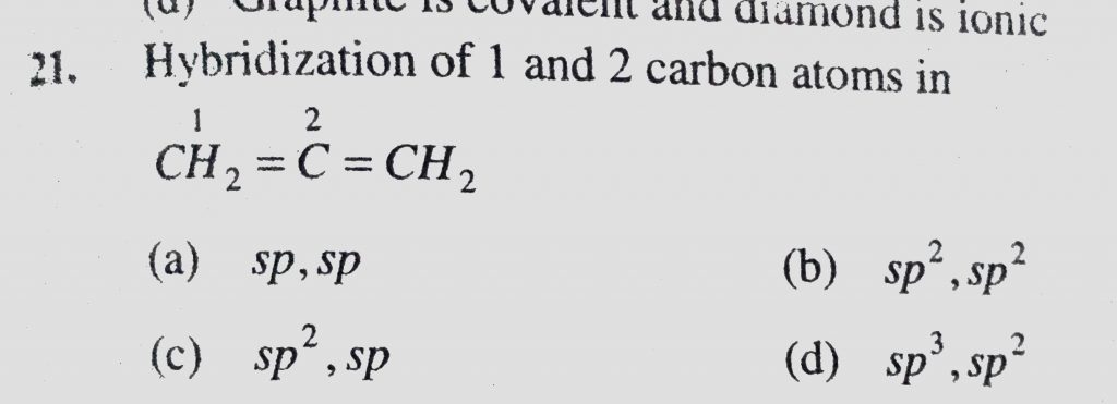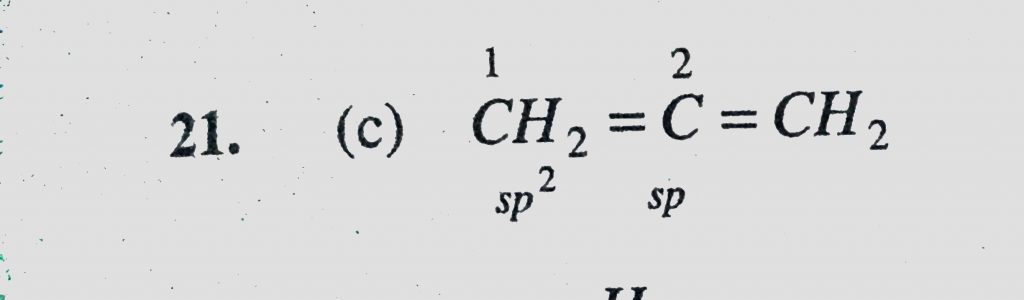 Hybridization of 1 and 2 carbon atoms in CH2 = C = CH2 (a) sp, sp (b) sp2, sp2 (c) sp2, sp Hybridization of 1 and 2 carbon atoms in CH2 = C = CH2 (a) sp sp sp (b) sp2 sp2 (c) sp2 December 8, 2020 Category: Uncategorised (JEE Advanced Physics by BM Sharma + GMP Solutions) , Facebook Messenger WhatsApp Share this:TwitterFacebook Related