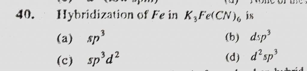 Hybridization of Fe in K3Fe(CN)6 is (a) sp3 (b) d sp3 (c) sp3 d2 (d) d2 sp3 Hybridization of Fe in K3Fe(CN)6 is (a) sp3 (b) d sp3 (c) sp3 d2 (d) d2 sp3 December 4, 2020 Category: Uncategorised (JEE Advanced Physics by BM Sharma + GMP Solutions) , Facebook Messenger WhatsApp Share this:TwitterFacebook Related