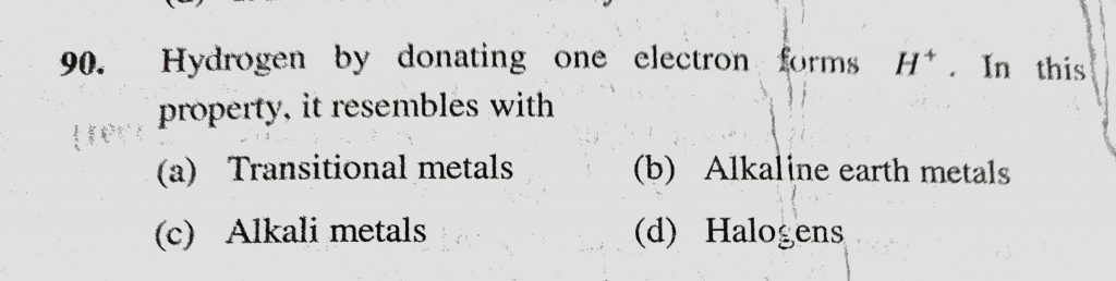 Hydrogen by donating one electron forms H+. In this property it resembles with (a) Transitional metals (b) Alkaline earth metals (c) Alkali metals (d) Halogens Hydrogen by donating one electron forms H+. In this property it resembles with (a) Transitional metals (b) Alkaline earth metals (c) Alkali metals (d) Halogens November 9, 2020 Category: Uncategorised (JEE Advanced Physics by BM Sharma + GMP Solutions) , Facebook Messenger WhatsApp Share this:TwitterFacebook Related