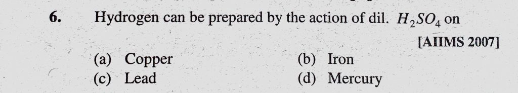 Hydrogen can be prepared by the action of dil. H2SO4 on (a) Copper (b) Iron (c) Lead (d) Mercury Hydrogen can be prepared by the action of dil. H2SO4 on (a) Copper (b) Iron (c) Lead (d) Mercury November 12, 2020 Category: Uncategorised (JEE Advanced Physics by BM Sharma + GMP Solutions) , Facebook Messenger WhatsApp Share this:TwitterFacebook Related