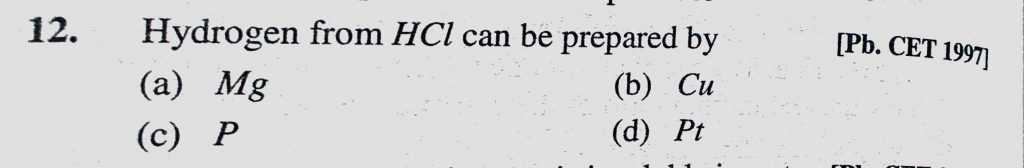 Hydrogen from HCl can be prepared by (a) Mg (b) Cu (c) P (d) Pt Hydrogen from HCl can be prepared by (a) Mg (b) Cu (c) P (d) Pt November 12, 2020 Category: Uncategorised (JEE Advanced Physics by BM Sharma + GMP Solutions) , Facebook Messenger WhatsApp Share this:TwitterFacebook Related