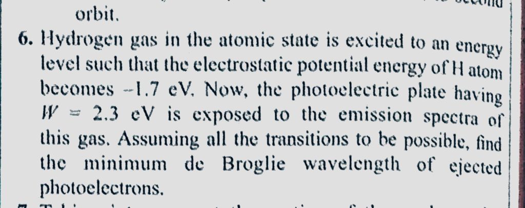 Hydrogen gas in the atomic state is excited to an energy levels such that the electrostatic potential energy of H atom becomes -1.7 eV. Now, the photoelectric plate having Hydrogen gas in the atomic state is excited to an energy levels such that the electrostatic potential energy of H atom becomes -1.7 eV. Now the photoelectric plate having October 15, 2020 Category: Uncategorised (JEE Advanced Physics by BM Sharma + GMP Solutions) , Facebook Messenger WhatsApp Share this:TwitterFacebook Related