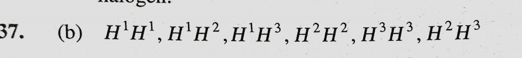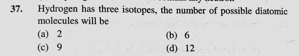 Hydrogen has three isotopes, the number of possible diatomic molecules will be (a) 2 (b) 6 (c) 9 (d) 12 Hydrogen has three isotopes the number of possible diatomic molecules will be (a) 2 (b) 6 (c) 9 (d) 12 November 13, 2020 Category: Uncategorised (JEE Advanced Physics by BM Sharma + GMP Solutions) , Facebook Messenger WhatsApp Share this:TwitterFacebook Related