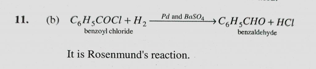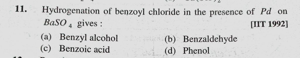 Hydrogenation of benzoyl chloride in the presence of Pd on BaSO4 gives : (a) Benzyl alcohol (b) Benzaldehyde (c) Benzoic acid (d) Phenol Hydrogenation of benzoyl chloride in the presence of Pd on BaSO4 gives : (a) Benzyl alcohol (b) Benzaldehyde (c) Benzoic acid (d) Phenol February 13, 2021 Category: Uncategorised (JEE Advanced Physics by BM Sharma + GMP Solutions) , Facebook Messenger WhatsApp Share this:TwitterFacebook Related