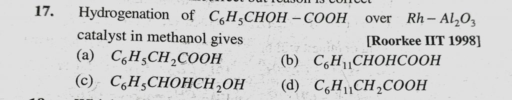 Hydrogenation of C6H5CHOH – COOH over Rh – Al2O3 catalyst in methanol gives (a) C6H5CH2COOH (b) C6H11CHOHCOOH (c) C6H5CHOHCH2OH (d) C6H11CH2COOH Hydrogenation of C6H5CHOH - COOH over Rh - Al2O3 catalyst in methanol gives (a) C6H5CH2COOH (b) C6H11CHOHCOOH (c) C6H5CHOHCH2OH (d) C6H11CH2COOH February 13, 2021 Category: Uncategorised (JEE Advanced Physics by BM Sharma + GMP Solutions) , Facebook Messenger WhatsApp Share this:TwitterFacebook Related