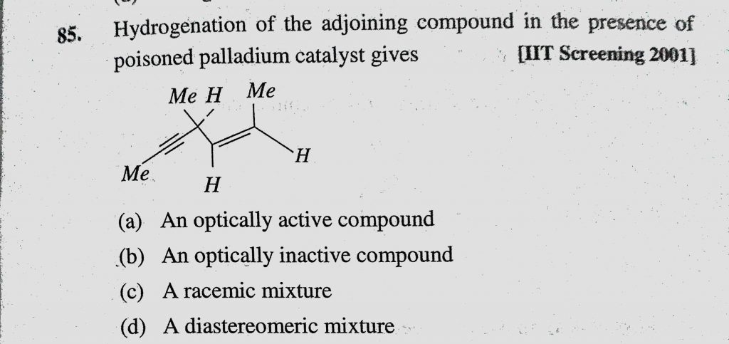 Hydrogenation of the adjoining compound in the presence of poisoned palladium catalyst gives (a) An optically active compound (b) An optically inactive compound Hydrogenation of the adjoining compound in the presence of poisoned palladium catalyst gives (a) An optically active compound (b) An optically inactive compound December 11, 2020 Category: Uncategorised (JEE Advanced Physics by BM Sharma + GMP Solutions) , Facebook Messenger WhatsApp Share this:TwitterFacebook Related