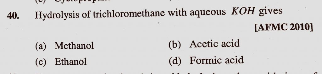 Hydrolysis of trichloromethane with aqueous KOH gives (a) Methanol (b) Acetic acid (c) Ethanol (d) Formic acid Hydrolysis of trichloromethane with aqueous KOH gives (a) Methanol (b) Acetic acid (c) Ethanol (d) Formic acid February 8, 2021 Category: Uncategorised (JEE Advanced Physics by BM Sharma + GMP Solutions) , Facebook Messenger WhatsApp Share this:TwitterFacebook Related