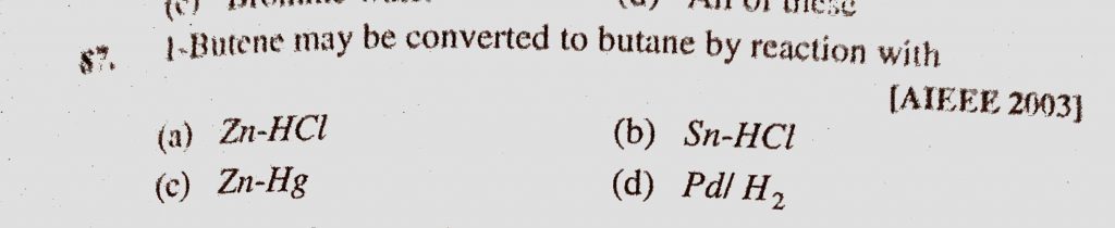 I-Butene may be converted to butane by reaction with (a) Zn-HCl (b) Sn-HCl (c) Zn-Hg (d) Pd/H2 I-Butene may be converted to butane by reaction with (a) Zn-HCl (b) Sn-HCl (c) Zn-Hg (d) Pd/H2 December 13, 2020 Category: Uncategorised (JEE Advanced Physics by BM Sharma + GMP Solutions) , Facebook Messenger WhatsApp Share this:TwitterFacebook Related