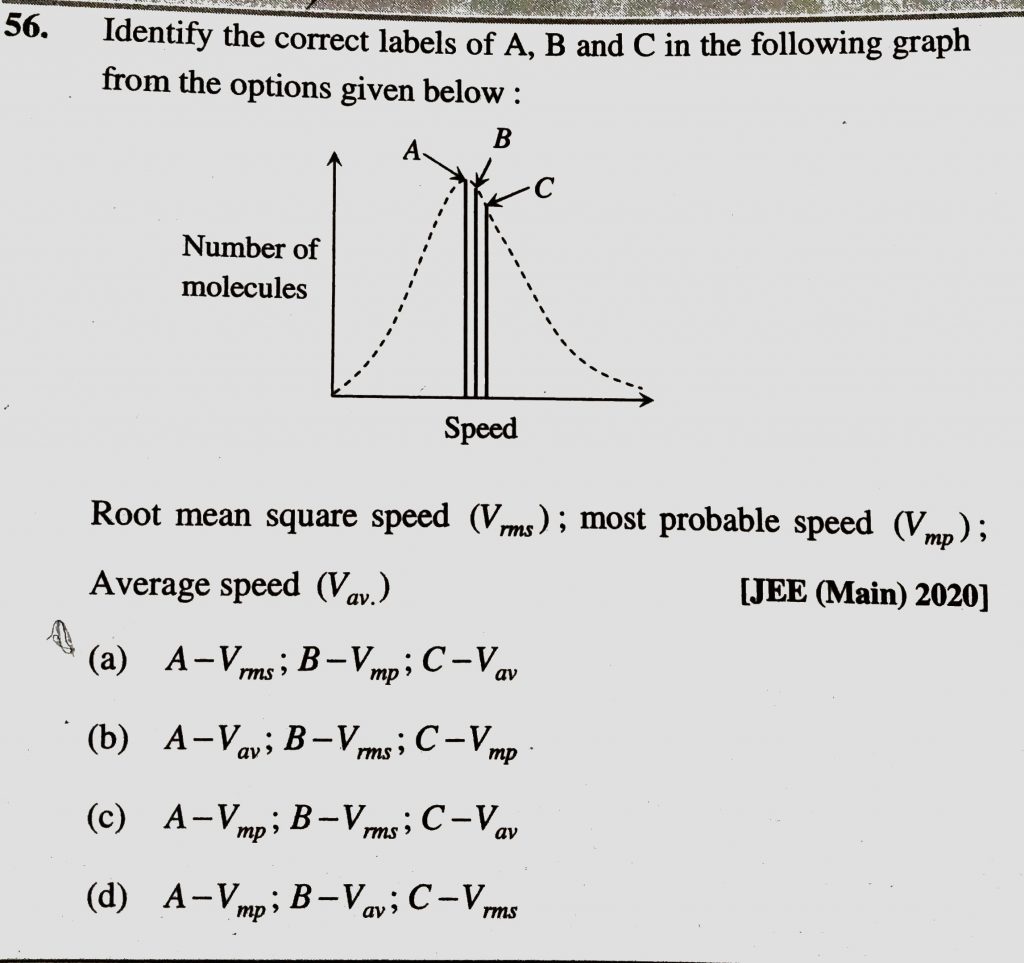 Identify the correct labels of A, B and C in the following graph from the options given below Root mean square speed (Vrms ) ; most probable speed (Vmp ) ; averge speed (Vav) B and C in the following graph from the options given below Root mean square speed (Vrms ) ; most probable speed (Vmp ) ; averge speed (Vav) Identify the correct labels of A February 12, 2021 Category: Uncategorised (JEE Advanced Physics by BM Sharma + GMP Solutions) , Facebook Messenger WhatsApp Share this:TwitterFacebook Related