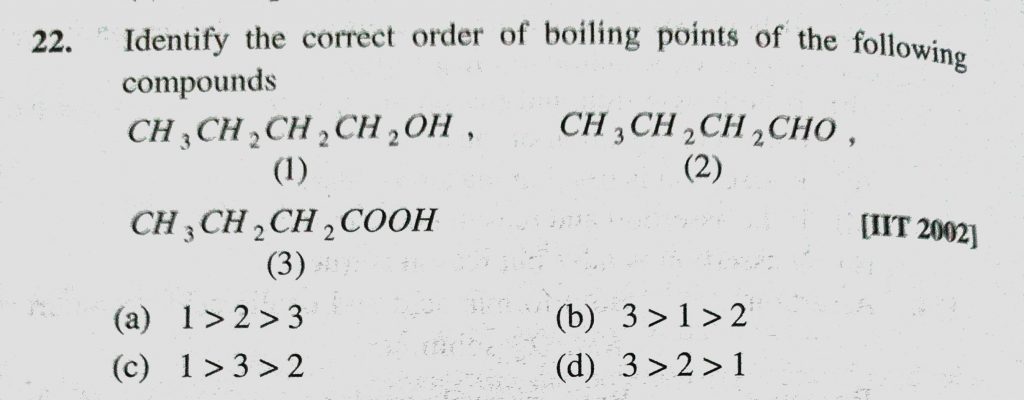 Identify the correct order of boiling points of the following compounds CH3CH2CH2CH2OH, CH3CH2CH2CHO, CH3CH2CH2COOH CH3CH2CH2CHO CH3CH2CH2COOH Identify the correct order of boiling points of the following compounds CH3CH2CH2CH2OH February 13, 2021 Category: Uncategorised (JEE Advanced Physics by BM Sharma + GMP Solutions) , Facebook Messenger WhatsApp Share this:TwitterFacebook Related