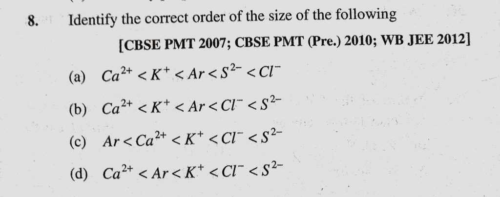 Identify the correct order of the size of the following (a) Ca 2+ < K + < Ar < S 2- < Cl – Identify the correct order of the size of the following (a) Ca 2+ < K + < Ar < S 2- < Cl - November 9, 2020 Category: Uncategorised (JEE Advanced Physics by BM Sharma + GMP Solutions) , Facebook Messenger WhatsApp Share this:TwitterFacebook Related