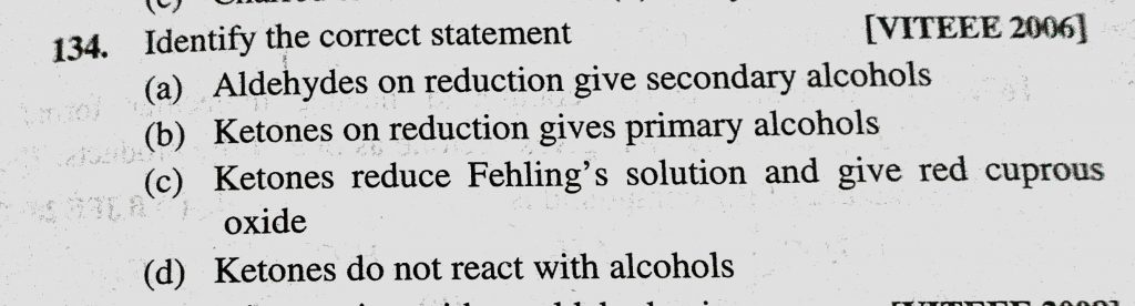 Identify the correct statement (a) Aldehydes on reduction gives secondary alcohols (b) Ketones on reduction gives primary alcohols (c) Ketones reduce Fehling’s solution and give red cuprous oxide Identify the correct statement (a) Aldehydes on reduction gives secondary alcohols (b) Ketones on reduction gives primary alcohols (c) Ketones reduce Fehling's solution and give red cuprous oxide February 12, 2021 Category: Uncategorised (JEE Advanced Physics by BM Sharma + GMP Solutions) , Facebook Messenger WhatsApp Share this:TwitterFacebook Related