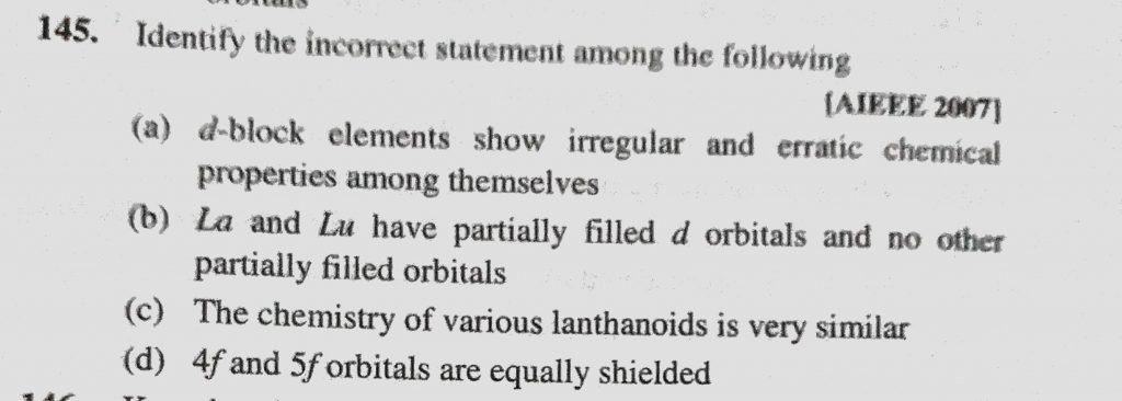Identify the incorrect statement among the following (a) d-block elements show irregular and erratic chemical properties among themselves Identify the incorrect statement among the following (a) d-block elements show irregular and erratic chemical properties among themselves November 30, 2020 Category: Uncategorised (JEE Advanced Physics by BM Sharma + GMP Solutions) , Facebook Messenger WhatsApp Share this:TwitterFacebook Related