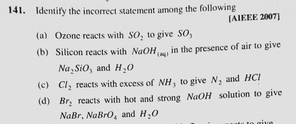 Identify the incorrect statement among the following (a) Ozone reacts with SO2 to give SO3 (b) Silicon reacts with NaOH(aq) in the presence of air to give Na2SiO3 and H2O Identify the incorrect statement among the following (a) Ozone reacts with SO2 to give SO3 (b) Silicon reacts with NaOH(aq) in the presence of air to give Na2SiO3 and H2O November 25, 2020 Category: Uncategorised (JEE Advanced Physics by BM Sharma + GMP Solutions) , Facebook Messenger WhatsApp Share this:TwitterFacebook Related