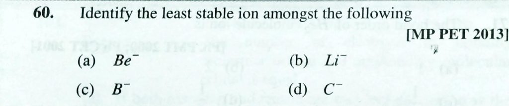 Identify the least stable ion amongst the following (a) Be^- (b) Li^- (c) B^- (d) C^- Identify the least stable ion amongst the following (a) Be^- (b) Li^- (c) B^- (d) C^- December 8, 2020 Category: Uncategorised (JEE Advanced Physics by BM Sharma + GMP Solutions) , Facebook Messenger WhatsApp Share this:TwitterFacebook Related