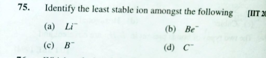 Identify the least stable ion amongst the following (a) Li ^- (b) Be^- (c) B^- (d) C^- Identify the least stable ion amongst the following (a) Li ^- (b) Be^- (c) B^- (d) C^- December 10, 2020 Category: Uncategorised (JEE Advanced Physics by BM Sharma + GMP Solutions) , Facebook Messenger WhatsApp Share this:TwitterFacebook Related