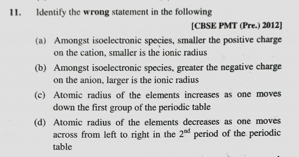 Identify the wrong statement in the following (a) Amongst isoelectronic species, smaller the positive charge on the cation, smaller is the ionic radius (b) Amongst isoelectronic Identify the wrong statement in the following (a) Amongst isoelectronic species smaller is the ionic radius (b) Amongst isoelectronic smaller the positive charge on the cation November 9, 2020 Category: Uncategorised (JEE Advanced Physics by BM Sharma + GMP Solutions) , Facebook Messenger WhatsApp Share this:TwitterFacebook Related