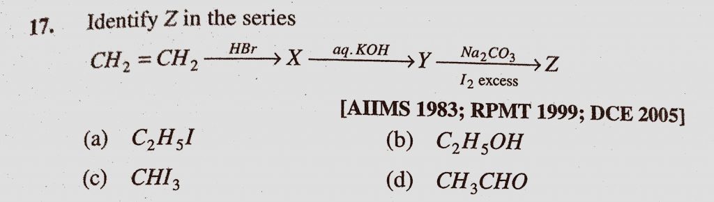 Identify Z in the series CH2=CH2 X Y Z (a) C2H5I (b) C2H5OH (c) CHI3 (d) CH3CHO Identify Z in the series CH2=CH2 X Y Z (a) C2H5I (b) C2H5OH (c) CHI3 (d) CH3CHO December 13, 2020 Category: Uncategorised (JEE Advanced Physics by BM Sharma + GMP Solutions) , Facebook Messenger WhatsApp Share this:TwitterFacebook Related