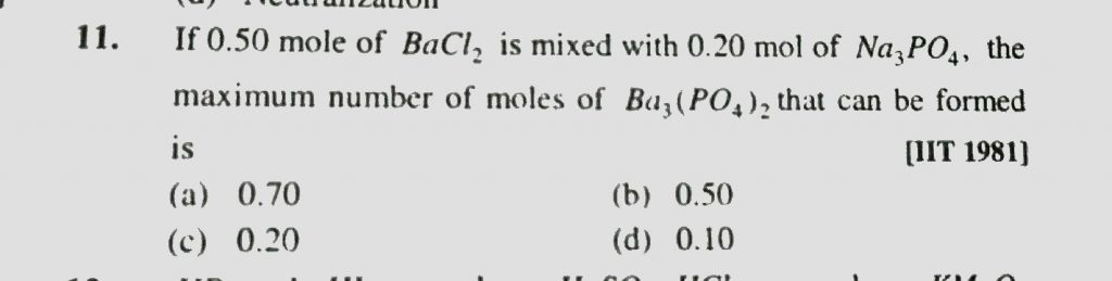 If 0.50 mole of BaCl2 is mixed with 0.20 mol of Na3PO4 , the maximum number of moles of Ba3(PO4)2 that can be formed is If 0.50 mole of BaCl2 is mixed with 0.20 mol of Na3PO4 the maximum number of moles of Ba3(PO4)2 that can be formed is November 24, 2020 Category: Uncategorised (JEE Advanced Physics by BM Sharma + GMP Solutions) , Facebook Messenger WhatsApp Share this:TwitterFacebook Related
