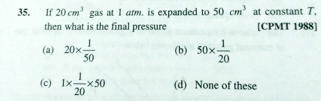 If 20 cm^3 gas at 1 atm , is expanded to 50 cm^3 at constant T, then what is the final pressure If 20 cm^3 gas at 1 atm is expanded to 50 cm^3 at constant T then what is the final pressure February 10, 2021 Category: Uncategorised (JEE Advanced Physics by BM Sharma + GMP Solutions) , Facebook Messenger WhatsApp Share this:TwitterFacebook Related