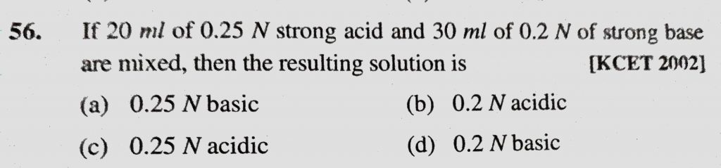If 20 ml of 0.25 N strong acid and 30 ml of 0.2 N of strong base are mixed , then the resulting solution is If 20 ml of 0.25 N strong acid and 30 ml of 0.2 N of strong base are mixed then the resulting solution is December 7, 2020 Category: Uncategorised (JEE Advanced Physics by BM Sharma + GMP Solutions) , Facebook Messenger WhatsApp Share this:TwitterFacebook Related