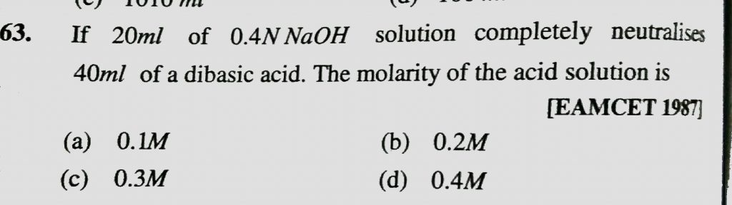 If 20 ml of 0.4 N NaOH solution completely neutralises 40 ml of a dibasic acid . THe molarity of the acid solution is If 20 ml of 0.4 N NaOH solution completely neutralises 40 ml of a dibasic acid. THe molarity of the acid solution is December 11, 2020 Category: Uncategorised (JEE Advanced Physics by BM Sharma + GMP Solutions) , Facebook Messenger WhatsApp Share this:TwitterFacebook Related
