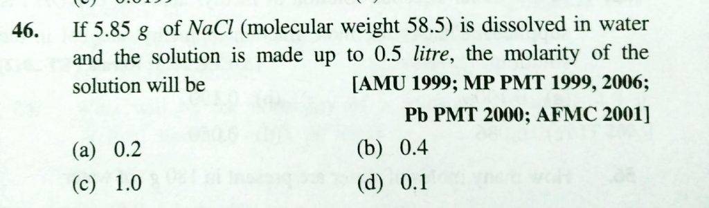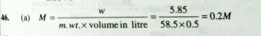If 5.85 g of NaCL (molecular weight 58.5 ) is dissolved in water and the solution is made up to 0.5 litre , the molarity of the solution will be If 5.85 g of NaCL (molecular weight 58.5 ) is dissolved in water and the solution is made up to 0.5 litre the molarity of the solution will be December 11, 2020 Category: Uncategorised (JEE Advanced Physics by BM Sharma + GMP Solutions) , Facebook Messenger WhatsApp Share this:TwitterFacebook Related
