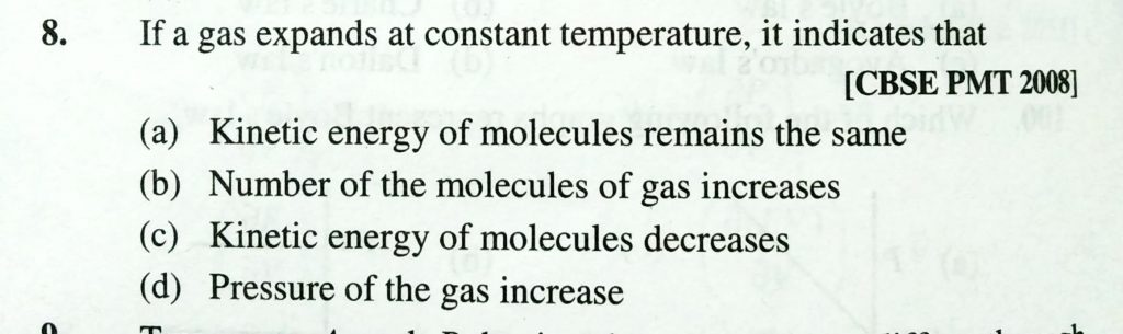 If a gas expands at constant temperature , it indicates that (a) Kinetic energy of molecules remains the same (b) Number of molecules of gas increases (c) kinetic energy of molecules decreases (d) Pressure of the gas increase If a gas expands at constant temperature it indicates that (a) Kinetic energy of molecules remains the same (b) Number of molecules of gas increases (c) kinetic energy of molecules decreases (d) Pressure of the gas increase February 11, 2021 Category: Uncategorised (JEE Advanced Physics by BM Sharma + GMP Solutions) , Facebook Messenger WhatsApp Share this:TwitterFacebook Related