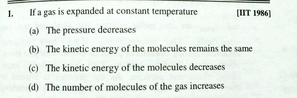 If a gas is expanded at constant temperature (a) The pressure decreases (b) The kinetic energy of the molecules remains the same (c) The kinetic energy of the molecules decreases (d) The number of molecules of the gas increases The ratio of the rate of diffussion of helium and methane under identical condition of pressure and temperature will be February 13, 2021 Category: Uncategorised (JEE Advanced Physics by BM Sharma + GMP Solutions) , Facebook Messenger WhatsApp Share this:TwitterFacebook Related