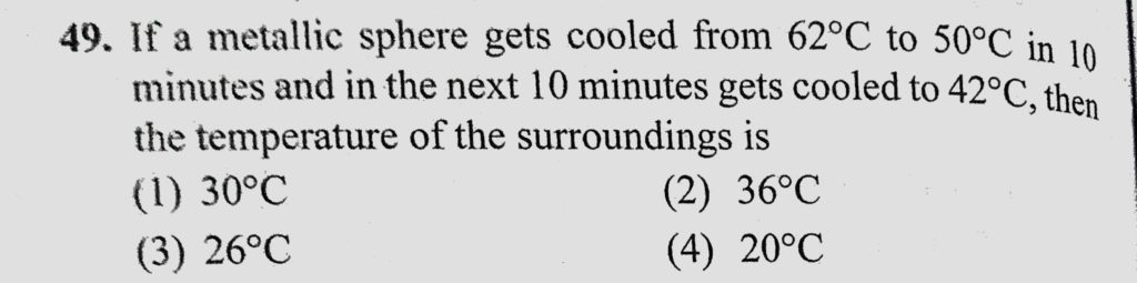 If a metallic sphere gets cooled from 62 C to 50 C in 10 minutes and in the next 10 minutes gets cooled to 42 C, then the temperature of the surroundings is If a metallic sphere gets cooled from 62 C to 50 C in 10 minutes and in the next 10 minutes gets cooled to 42 C then the temperature of the surroundings is October 25, 2020 Category: Uncategorised (JEE Advanced Physics by BM Sharma + GMP Solutions) , Facebook Messenger WhatsApp Share this:TwitterFacebook Related