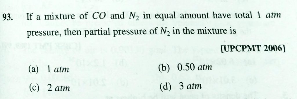 If a mixture of CO and N2 in equal amount have total 1 atm pressure , then partial pressure of N2 in the mixture is (a) 1 atm (b) 0.50 atm (c) 2 atm (d) 3 atm If a mixture of CO and N2 in equal amount have total 1 atm pressure then partial pressure of N2 in the mixture is (a) 1 atm (b) 0.50 atm (c) 2 atm (d) 3 atm February 11, 2021 Category: Uncategorised (JEE Advanced Physics by BM Sharma + GMP Solutions) , Facebook Messenger WhatsApp Share this:TwitterFacebook Related