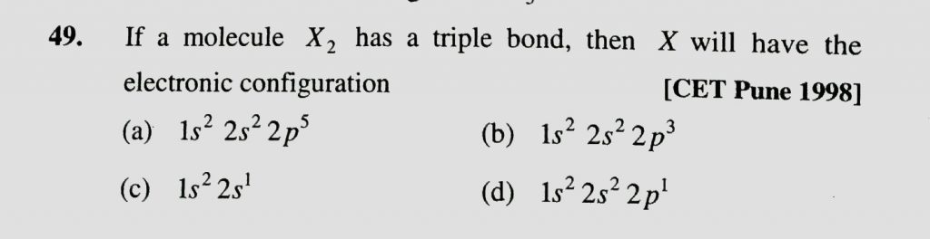 If a molecule X2 has a triple bond , then X will have the electronic configuration If a molecule X2 has a triple bond then X will have the electronic configuration December 1, 2020 Category: Uncategorised (JEE Advanced Physics by BM Sharma + GMP Solutions) , Facebook Messenger WhatsApp Share this:TwitterFacebook Related