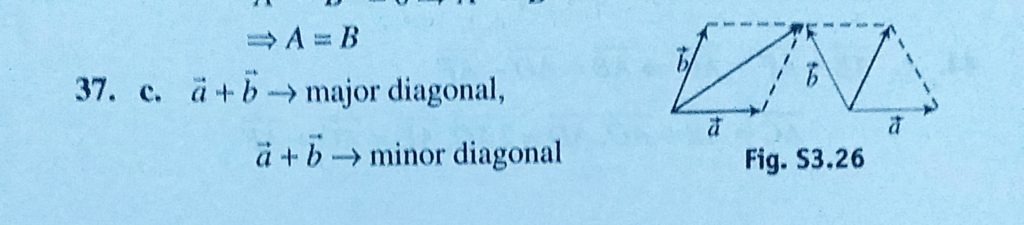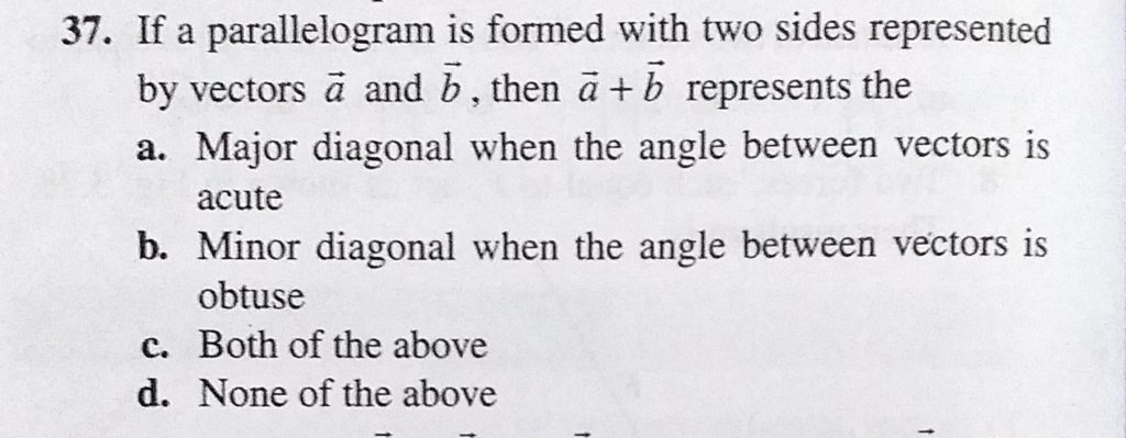 If a parallelogram is formed with two sides represented by vectors a and b, then a + b represents the a. Major diagonal when the angle between vectors is acute b. Minor diagonal If a parallelogram is formed with two sides represented by vectors a and b then a + b represents the a. Major diagonal when the angle between vectors is acute b. Minor diagonal September 17, 2020 Category: Uncategorised (JEE Advanced Physics by BM Sharma + GMP Solutions) , Facebook Messenger WhatsApp Share this:TwitterFacebook Related