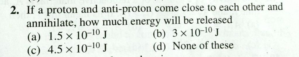 If a proton and anti – proton come close to each other and annihilate, how much energy will be released how much energy will be released If a proton and anti - proton come close to each other and annihilate September 14, 2020 Category: Uncategorised (JEE Advanced Physics by BM Sharma + GMP Solutions) , Facebook Messenger WhatsApp Share this:TwitterFacebook Related