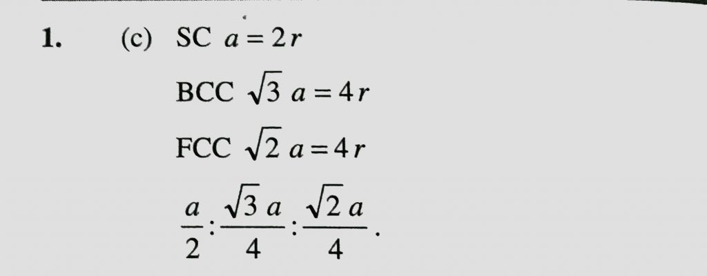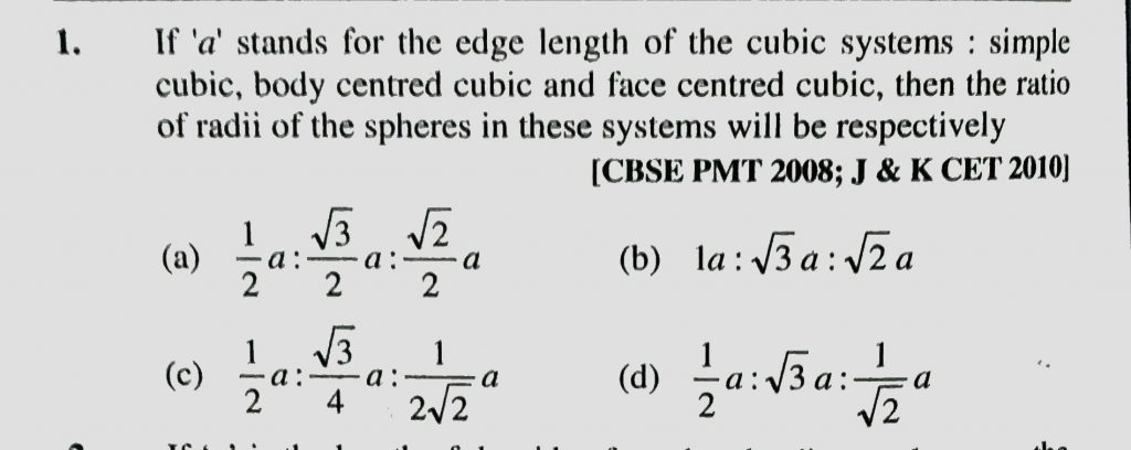 If ‘a’ stands for the edge length of the cubic system : simple cubic, body centered cubic and face centered cubic , then the ratio of radii of the spheres in these system will be respectively body centered cubic and face centered cubic If 'a' stands for the edge length of the cubic system : simple cubic then the ratio of radii of the spheres in these system will be respectively December 16, 2020 Category: Uncategorised (JEE Advanced Physics by BM Sharma + GMP Solutions) , Facebook Messenger WhatsApp Share this:TwitterFacebook Related