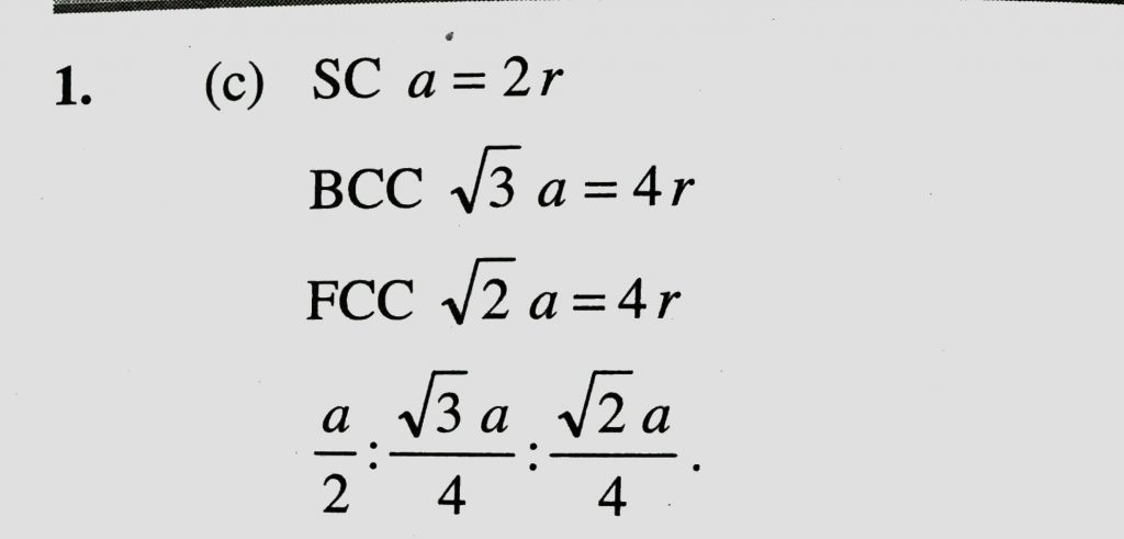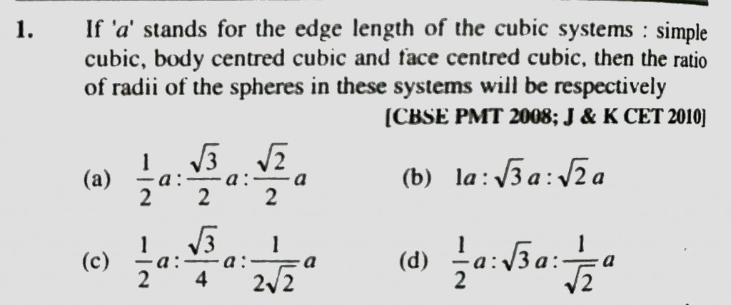 If ‘a’ stands for the edge length of the cubic systems : simple cubis body centred and face centred cubic , then the ratio of radii of the spheres in these systems will be respectively If 'a' stands for the edge length of the cubic systems : simple cubis body centred and face centred cubic then the ratio of radii of the spheres in these systems will be respectively February 8, 2021 Category: Uncategorised (JEE Advanced Physics by BM Sharma + GMP Solutions) , Facebook Messenger WhatsApp Share this:TwitterFacebook Related