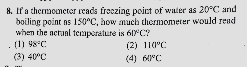 If a thermometer reads freezing point of water as 20 C and boiling point as 150 C, how much thermometer would read when the actual temperature is 60 C ? how much thermometer would read when the actual temperature is 60 C ? If a thermometer reads freezing point of water as 20 C and boiling point as 150 C October 23, 2020 Category: Uncategorised (JEE Advanced Physics by BM Sharma + GMP Solutions) , Facebook Messenger WhatsApp Share this:TwitterFacebook Related