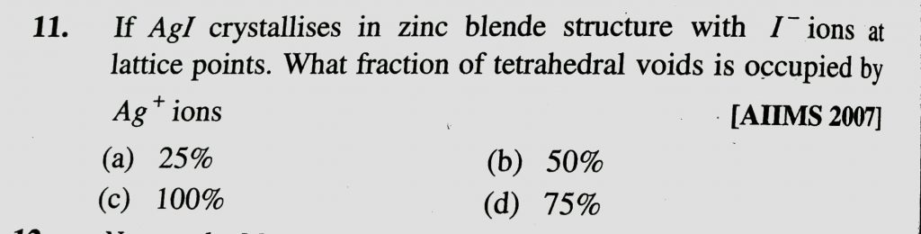 If AgI crystallises in zinc blende structure with I^- ions at lattice points. what fraction tetrahedral voids is occupied by Ag^+ ions If AgI crystallises in zinc blende structure with I^- ions at lattice points. what fraction tetrahedral voids is occupied by Ag^+ ions February 8, 2021 Category: Uncategorised (JEE Advanced Physics by BM Sharma + GMP Solutions) , Facebook Messenger WhatsApp Share this:TwitterFacebook Related