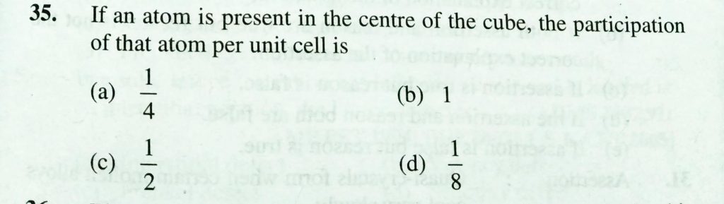 If an atom is present in the centre of the cube , the participation of that atom per unit cell is (a) 1/4 (b) 1 (c) 1/2 (d) 1/8 If an atom is present in the centre of the cube the participation of that atom per unit cell is (a) 1/4 (b) 1 (c) 1/2 (d) 1/8 February 9, 2021 Category: Uncategorised (JEE Advanced Physics by BM Sharma + GMP Solutions) , Facebook Messenger WhatsApp Share this:TwitterFacebook Related