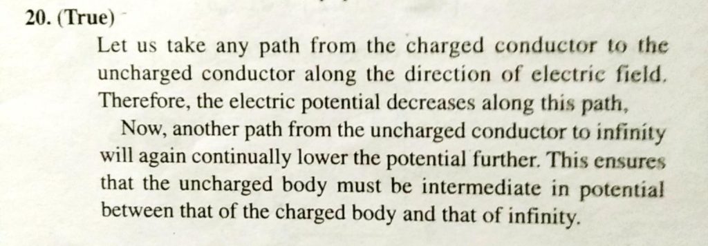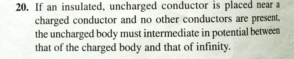 If an insulated, uncharged conductor is placed near a charged conductor and no other conductors are present, the uncharged body must intermediate in potential between that of the charged body and that of infinity. If an insulated the uncharged body must intermediate in potential between that of the charged body and that of infinity. uncharged conductor is placed near a charged conductor and no other conductors are present September 18, 2020 Category: Uncategorised (JEE Advanced Physics by BM Sharma + GMP Solutions) , Facebook Messenger WhatsApp Share this:TwitterFacebook Related