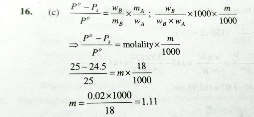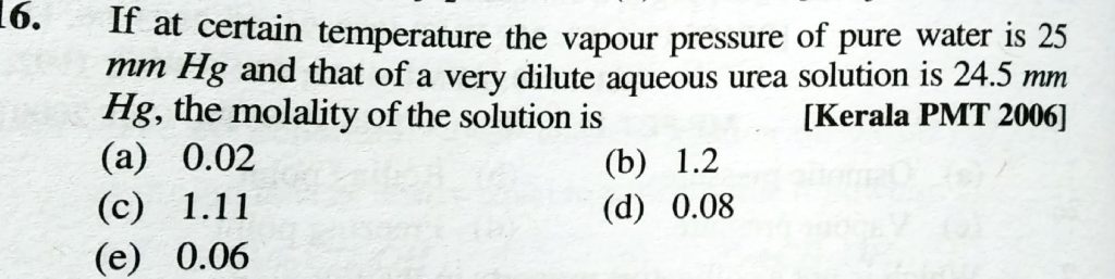 If at certain temperature the vapour pressure of pure water is 25 mm Hg anbd that of a very dilute aqueous urea solution is 24.5 mm Hg , the molality of the solution is If at certain temperature the vapour pressure of pure water is 25 mm Hg anbd that of a very dilute aqueous urea solution is 24.5 mm Hg the molality of the solution is December 12, 2020 Category: Uncategorised (JEE Advanced Physics by BM Sharma + GMP Solutions) , Facebook Messenger WhatsApp Share this:TwitterFacebook Related