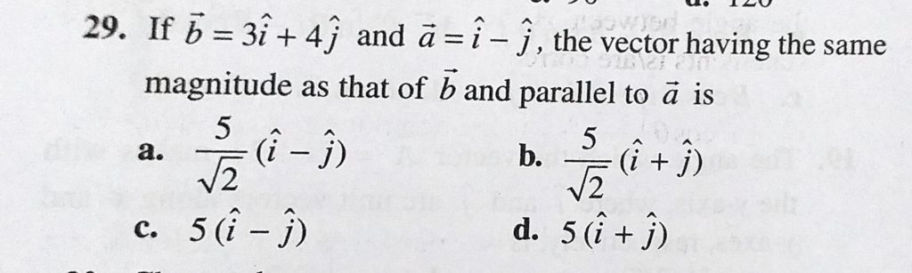If b = 3i + 4j and a = i – j, the vector having the same magnitude as that of b and parallel to a is If b = 3i + 4j and a = i - j the vector having the same magnitude as that of b and parallel to a is September 17, 2020 Category: Uncategorised (JEE Advanced Physics by BM Sharma + GMP Solutions) , Facebook Messenger WhatsApp Share this:TwitterFacebook Related