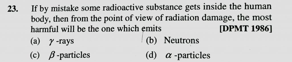 If by mistake some radioactive substance get inside the human body , then from the point of view of radiation damage , the most harmful will be the one which emits If by mistake some radioactive substance get inside the human body the most harmful will be the one which emits then from the point of view of radiation damage February 13, 2021 Category: Uncategorised (JEE Advanced Physics by BM Sharma + GMP Solutions) , Facebook Messenger WhatsApp Share this:TwitterFacebook Related